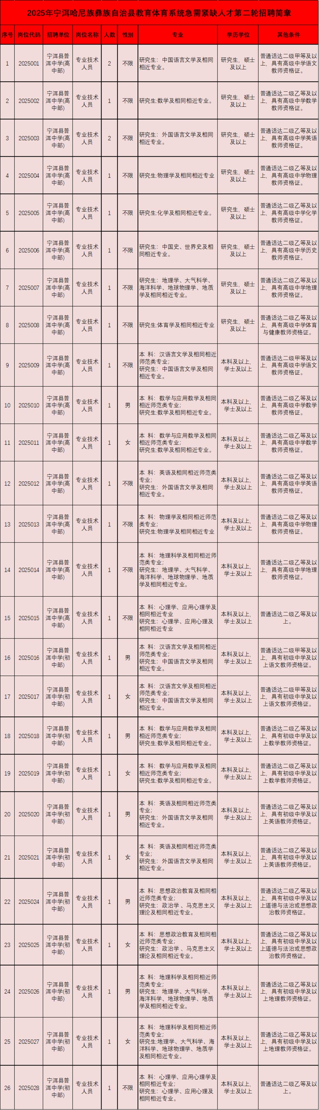 具體招聘崗位及要求詳見(jiàn)《寧洱縣2025年教育體育系統(tǒng)急需緊缺人才第二輪招聘簡(jiǎn)章》(附件1)。