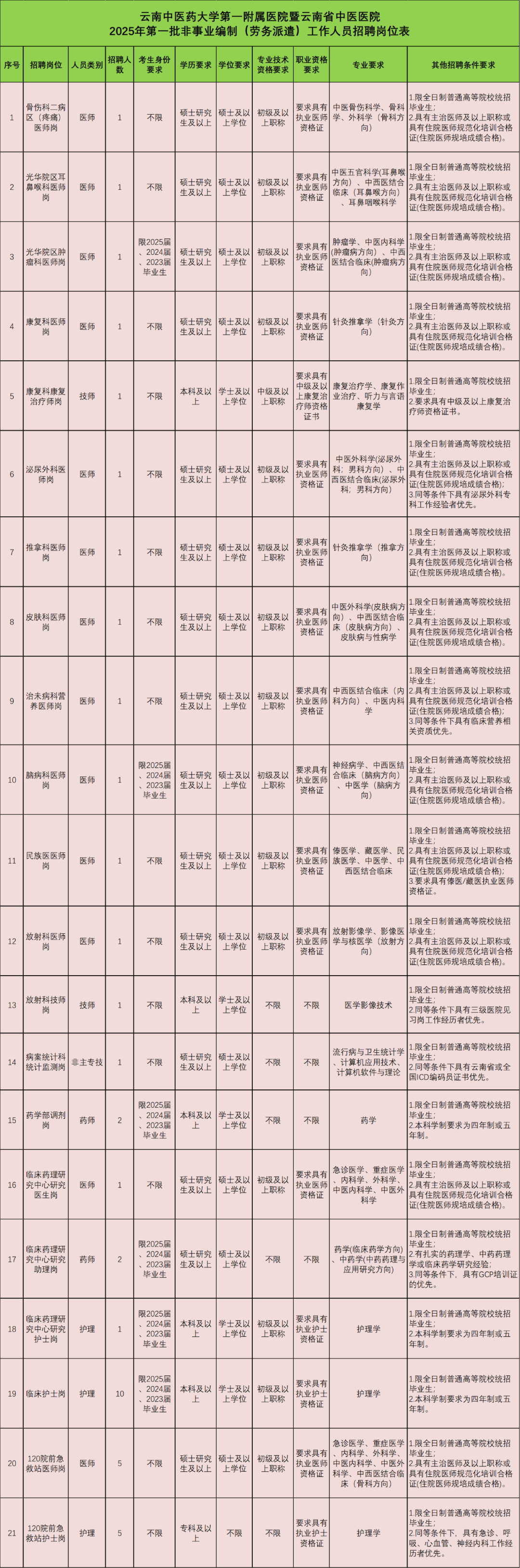 附件1:云南中醫(yī)藥大學第一附屬醫(yī)院暨云南省中醫(yī)醫(yī)院2025年第一批非事業(yè)編制(勞務派遣)工作人員招聘崗位表.xlsx