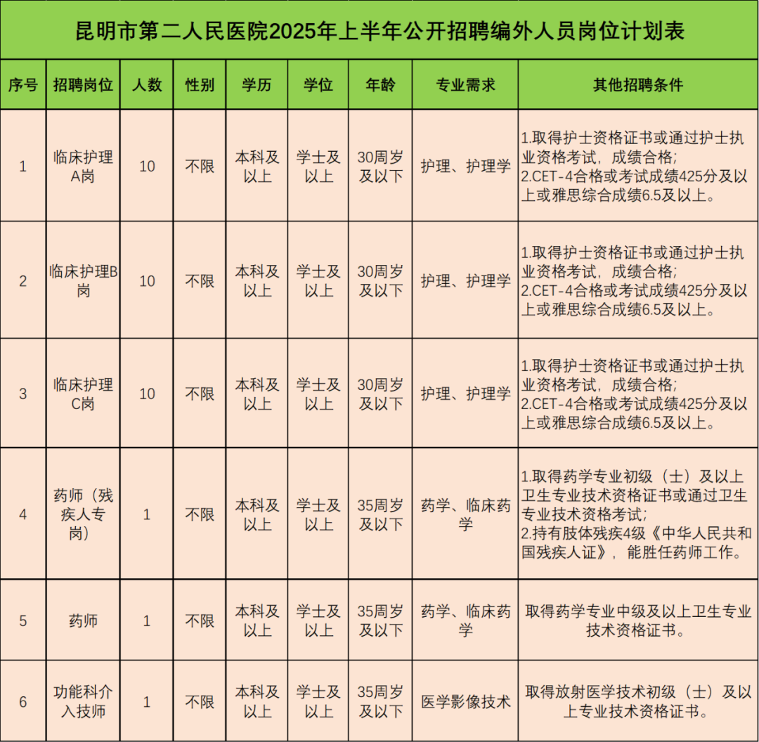 具體招聘崗位及招聘條件,詳見《昆明市第二人民醫(yī)院2025年上半年公開招聘編外人員崗位計(jì)劃表》(以下簡稱《崗位計(jì)劃表》)。